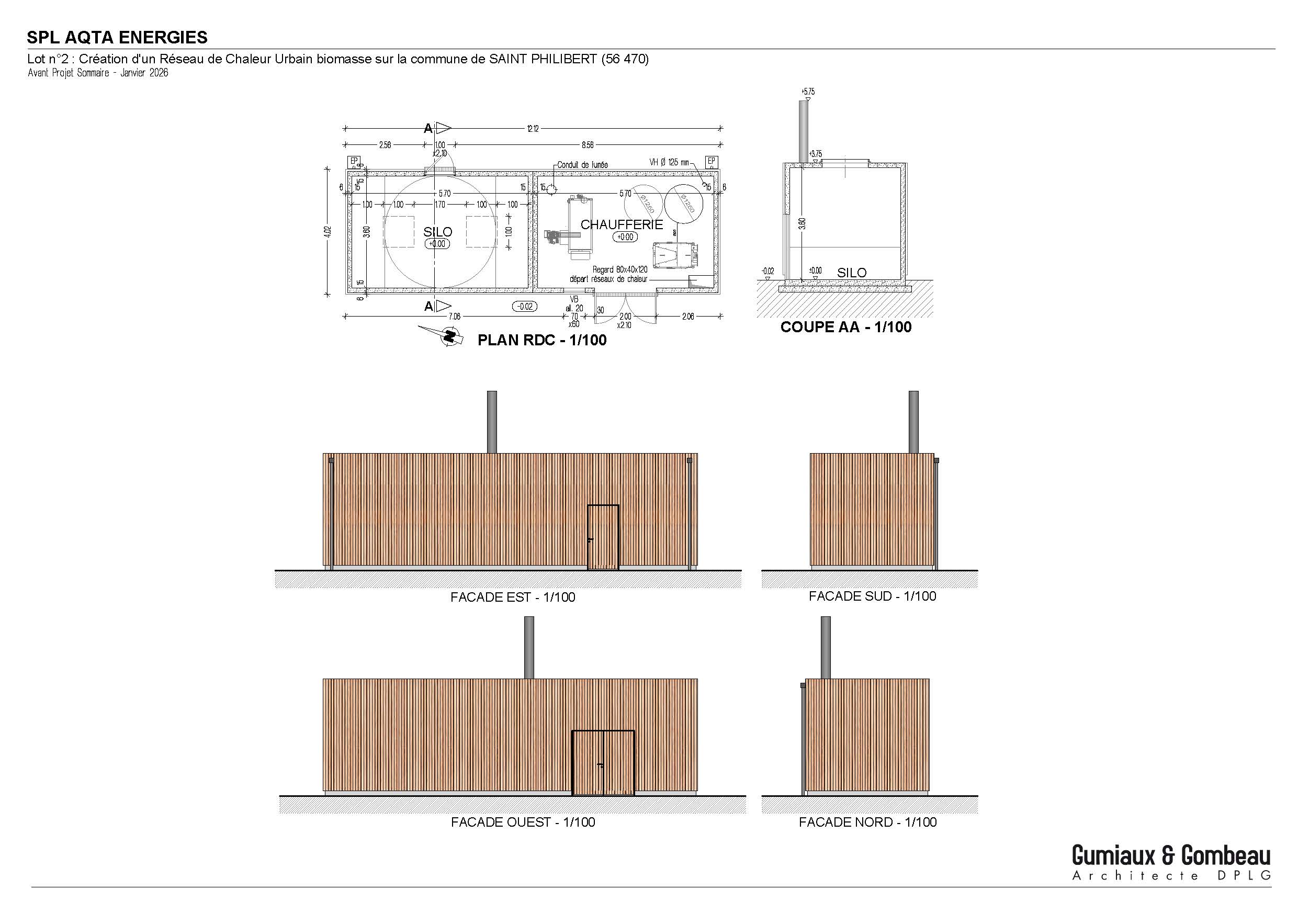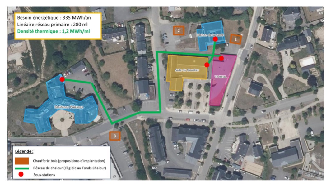 - Création d’une chaufferie bois avec un réseau de chaleur pour chauffer la salle du Mousker, la résidence Plaisance, la crèche Ty Heol et la maison de la santé. > Début des travaux prévus au premier semestre 2026 avec une mise en service en octobre.La solution bois permet de remplacer l’énergie électrique et fossile actuellement consommée par une énergie issue d’une ressource locale, renouvelable et gérée durablement par AQTA. Cette solution permet ainsi d’améliorer la maitrise de la dépense énergétique dans les années à venir, baisser les émissions de gaz à effet de serre et participer au développement de la filière locale génératrice d’emplois non délocalisables.Compte tenu de la puissance du projet il est envisageable d’installer une chaufferie préfabriquée d’une surface d’environ 40 m² (chaufferie + silo de stockage du bois). Cette solution permet de réduire le budget d’investissement, l’emprise au sol et la durée des travaux.L’objectif est de positionner la chaufferie au plus près du tracé du réseau de chaleur afin d’en diminuer au maximum le linéaire.La chaufferie sera installée idéalement à une distance minimale de 10 mètres des autres bâtiments pour éviter les surcouts liés à la réglementation incendie.Le lieu et les conditions d’implantation de la chaufferie devront respecter les règles d’urbanisme.